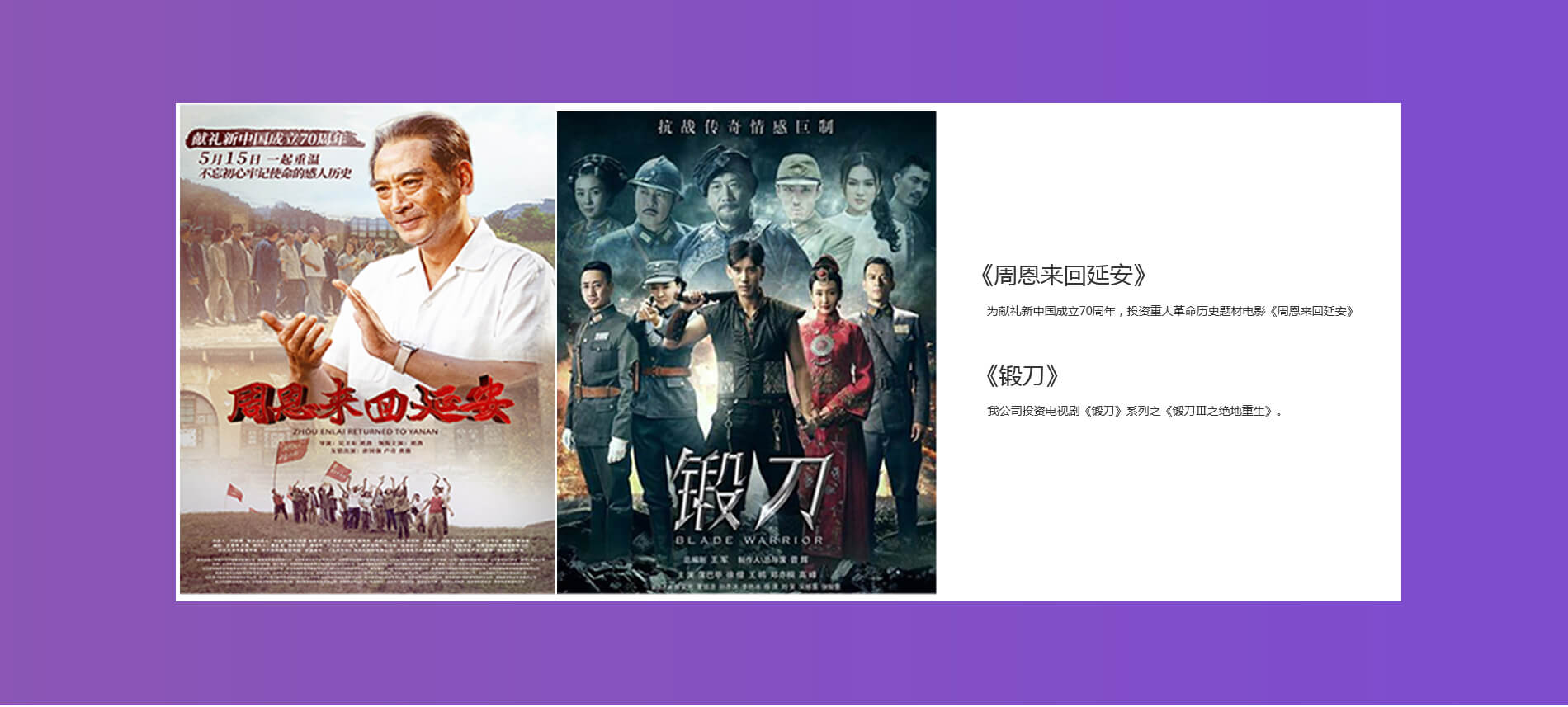 為獻禮新中國成立70周年,投資重大革命歷史題材電影《周恩來回延安》。2017年12月15日,電影項目啟動儀式暨新聞發布會在釣魚臺國賓館舉行。電影《周恩來回延安》從創作之初就受到了中宣部、文化和旅游部、中共中央文獻研究室、國家廣播電視總局等單位的關注和指導,并得到了周恩來同志的親屬及他曾經的秘書、警衛等各界人士的大力支持。該片上映后受到社會各界的高度評價,不僅作為教學課程在中共中央黨校點映,還入選中宣部、教育部等聯合主辦的“看紅色電影,愛偉大祖國”優秀電影進校園系列活動播放影片。中宣部《黨建》雜志社更是召開以“弘揚周總理崇高精神,不忘初心、牢記使命”為主題的研討會,總結研討了該片的藝術成就、思想內涵及現實意義。9月,該片獲得了第十五屆精神文明建設“五個一工程”獎。 《周恩來回延安》以1973年6月被檢查出患有癌癥的周恩來總理回到闊別二十六年的延安,延安的十三年往事歷歷在目,這方熱土養育了中國革命,養育了人民軍隊,形成了中國共產黨第一代領導集體,鑄就了中國共產黨的領導地位。演繹一代偉人對人民的深情牽掛,講述周恩來總理時隔26年回到革命圣地延安的短暫22小時,謳歌中國共產黨與人民血肉相連及不忘初心、不懈奮斗、砥礪前行的偉大精神。 影片上映以來,人民網、新華網、央視網等核心官方媒體紛紛給予肯定評價,好評如潮,可見影片影響之轟動和廣泛。